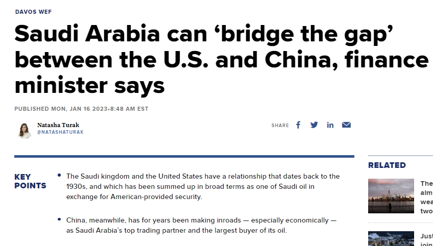 "사우디 아라비아가 미국과 중국 사이의 틈을 메울 수 있다고, (사우디) 재무장관이 말했다"