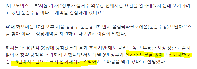 1월 3일 정부의 부동산대책에 의해 둔촌주공 아파트 청약/계약이 활기를 띄고 있다는 글이다.