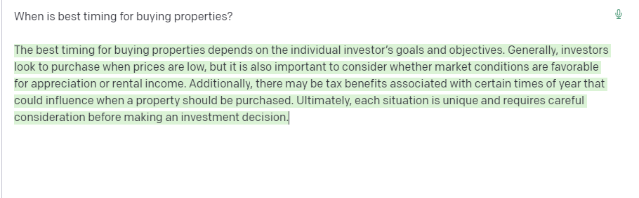 ==> 최적의 부동산 구매시점은 개인투자자의 목표와 재무상태에 달려있습니다. (이봐, 그 정도는 나도 얘기할수 있다고!) 일반적으로, 가격이 하락할때 투자자들은 구매하는 것을 검토합니다. 그러나 시장상황을 고려하는 것도 중요합니다. 임대료 수익에 우호적인 조건이 조성된. 게다가 수년간 자산으로 인해 세금혜택을 얻을 수 있다면 반드시 구매해야 합니다. 투자 결정을 하기전에 각 상황은 독특하고 조심스럽게 검토되어야 합니다.