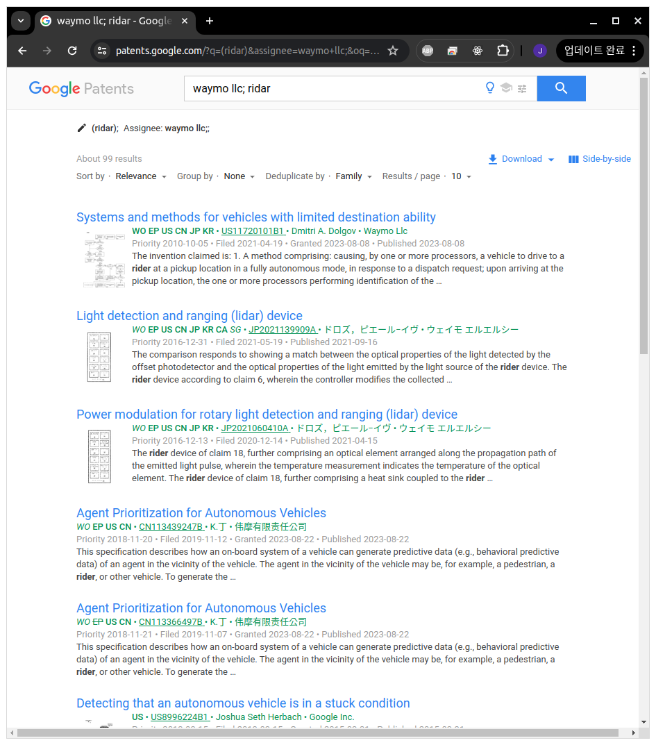 - 구글의 자회사인 waymo(자율주행기업)의 경우에는 Lidar 한정하여 90여건의 특허있음