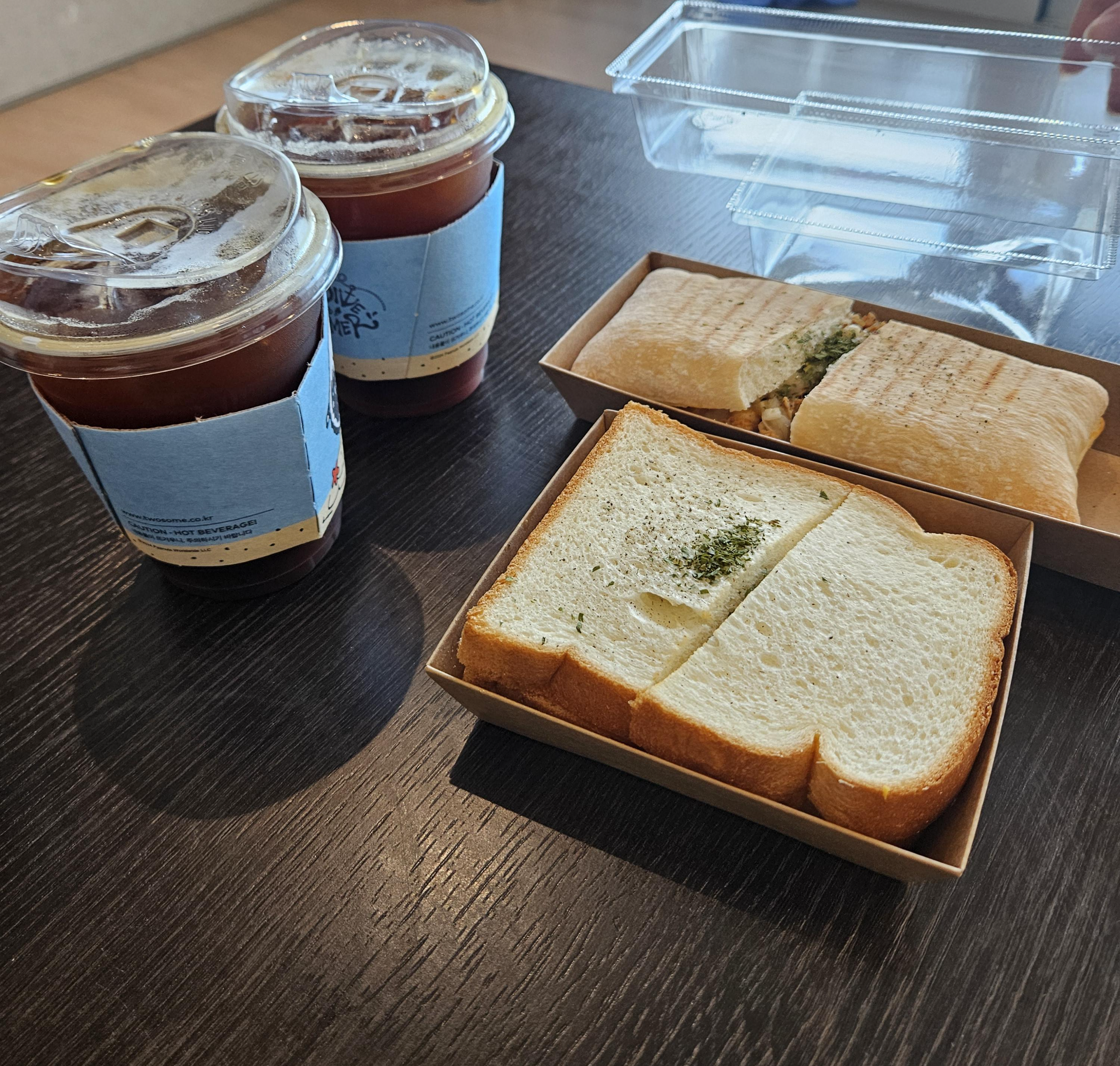 오후에 어머니가 고속버스를 타고 안면도에 오시기로 해서, 오전에는 객실에서 쉬고 오후에 수영장에 가기로 했습니다. 아침 9시가 되기 이전에 벌써부터 청소하거나 아이들이 뛰어다니는 소리가 가득해서 더이상 누워있기는 힘들었습니다. 아침식사는 투썸플레이스에서 테이크아웃 하기로 정해놨기 때문에 슬리퍼를 신고 천천히 이동했습니다. 특정 푸드류에 커피를 추가하면 할인을 제공하는 프로모션을 하고 있어서, 파니니와 샌드위치 그리고 커피를 구입하였습니다. 맛은 적당했습니다. 아주 맛있지는 않았지만 맛없어서 그대로 쓰레기통에 버리지는 않았습니다. 커피는 출근시 항상 먹던 그 맛과 같아서 만족했습니다. 오랜만에 투썸플레이스 커피를 마신 와이프는 커피맛에 아주 만족했습니다. 참고로 저는 탄맛이 덜한 아로마노트를 주로 마셨습니다.