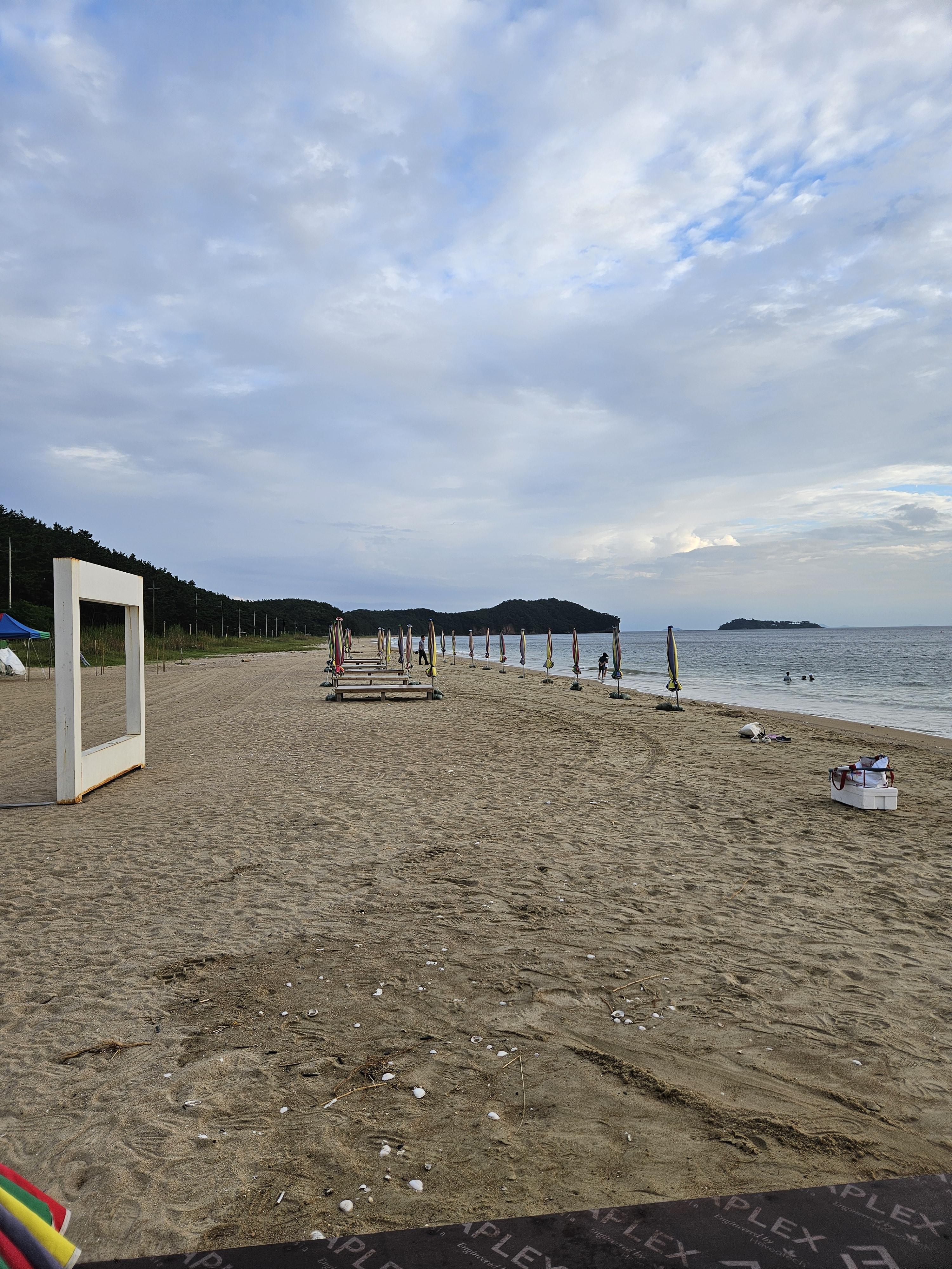숙소가 정리될 동안 투썸플레이스에서 바다를 보면서 시간을 좀 보냈습니다. 수박주스, 커피와 케익을 먹으면서 바다를 구경하고 쉬었습니다. 숙소가 정리된 이후에 객실 정비가 완료되었다는 전화가 왔고, 객실에 들려서 해수욕장으로 나갈 옷으로 갈아입었습니다. 튜브와 모래놀이를 할 장난감을 챙겨서 해수욕장으로 향했습니다. 서해는 동해와 다르게 바다의 수심이 깊지 않기 때문에 나이가 어린 아이와 놀기가 매우 좋은 곳입니다. 먼저 모래사장에서 모래놀이를 조금 하다가, 튜브에 태워서 파도 위를 둥실둥실 넘어가는 놀이를 하였습니다. 다시 모래사장에서 모래놀이를 하다가.. 바닷가에서 튜브를 타고 노는 반복적인 놀이를 하면서 깔깔대고 웃으며 즐거운 시간을 보냈습니다.