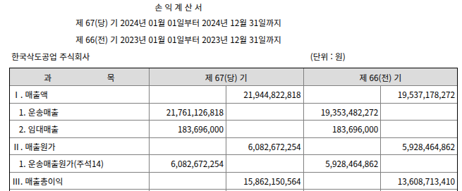 한국삭도공업의 2024년 손익계산서는 안정적인 매출 성장과 뛰어난 수익 구조를 명확히 보여줍니다.